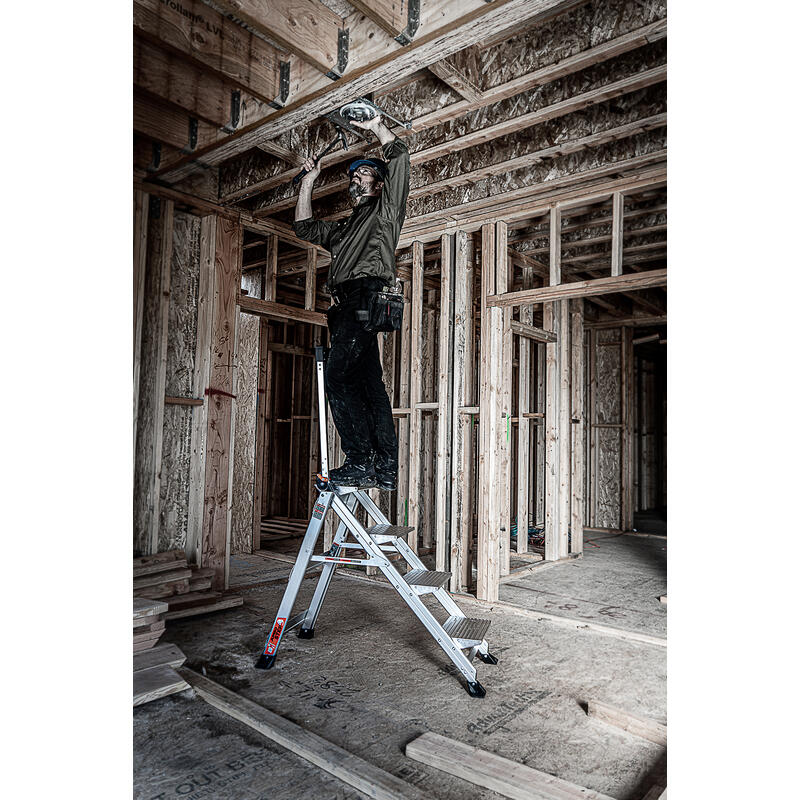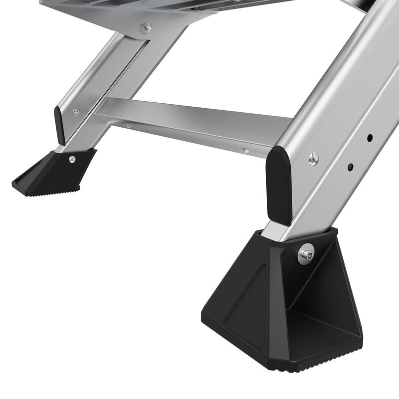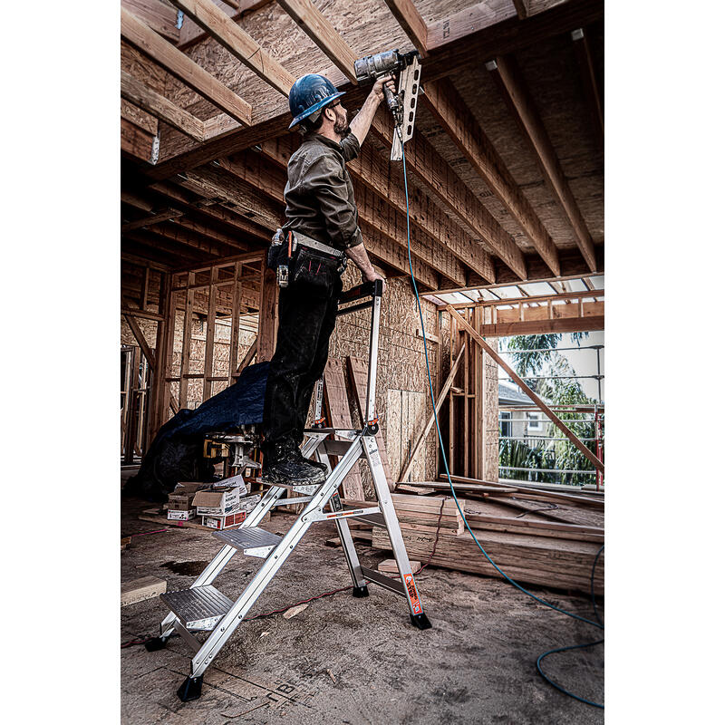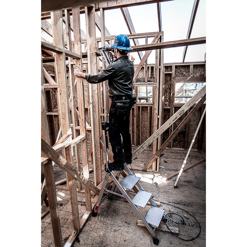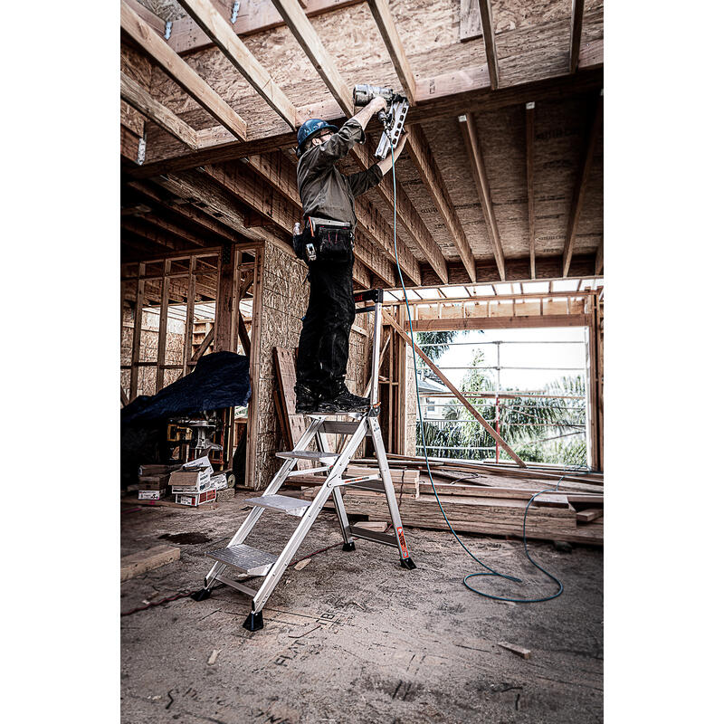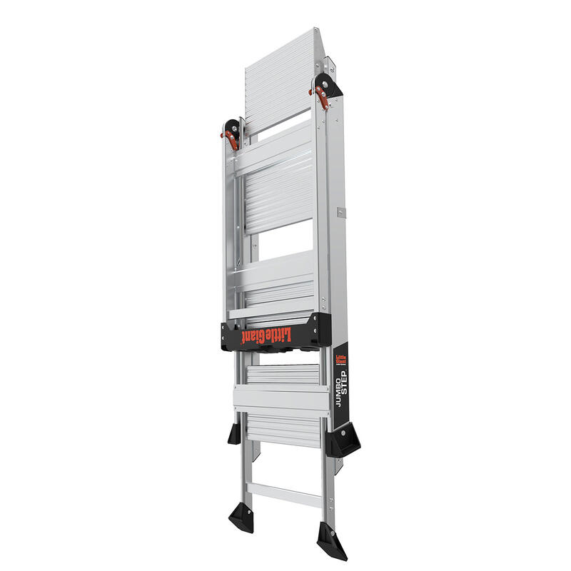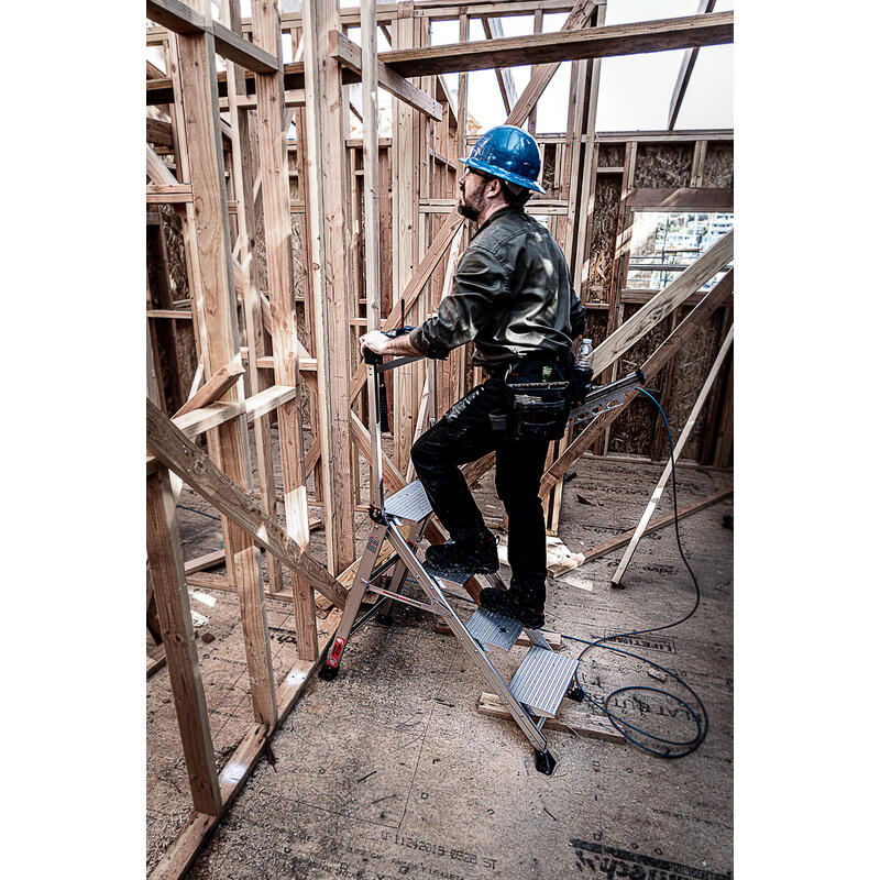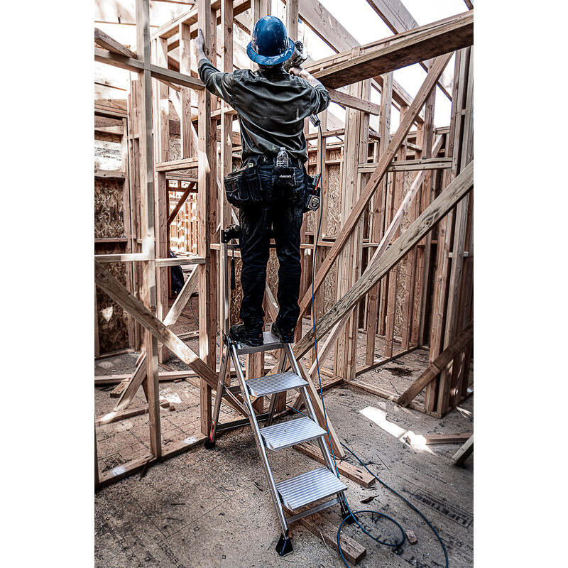 With the Jumbo Step's ultra-wide steps, it feels like walking up a staircase, not a ladder. It is made from lightweight, aircraft grade aluminum and its steps feature a safe, non-slip surface.