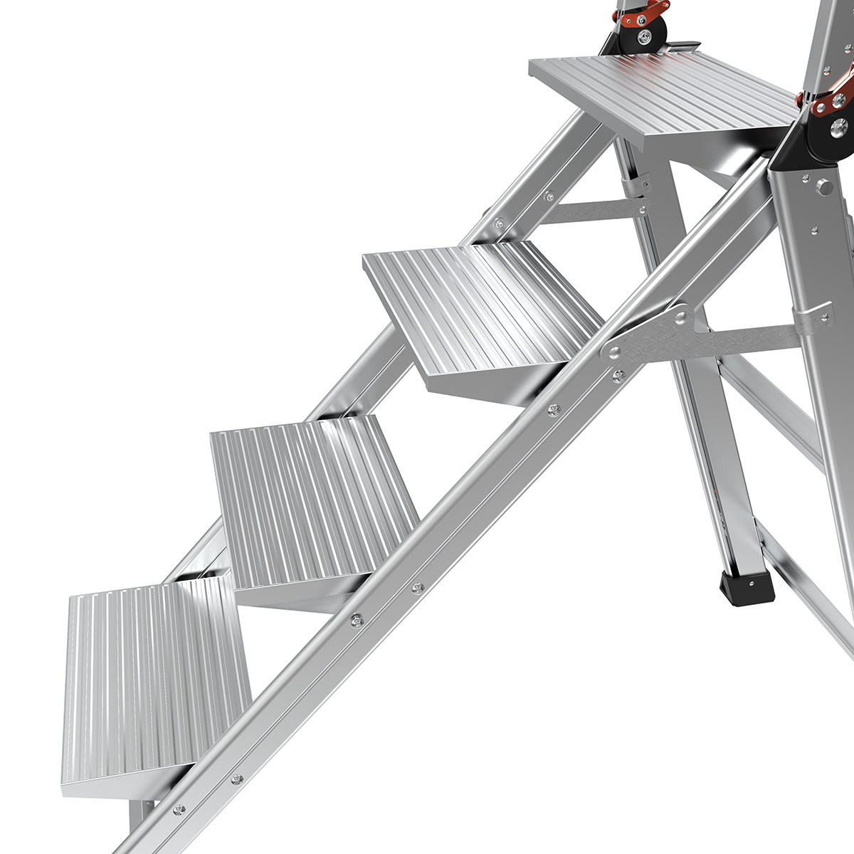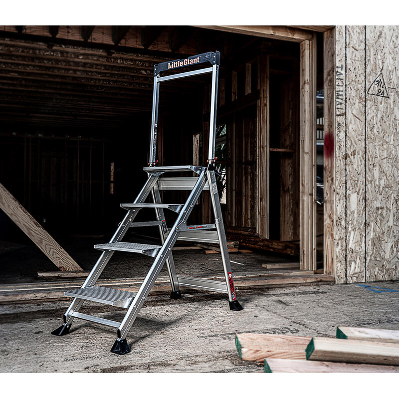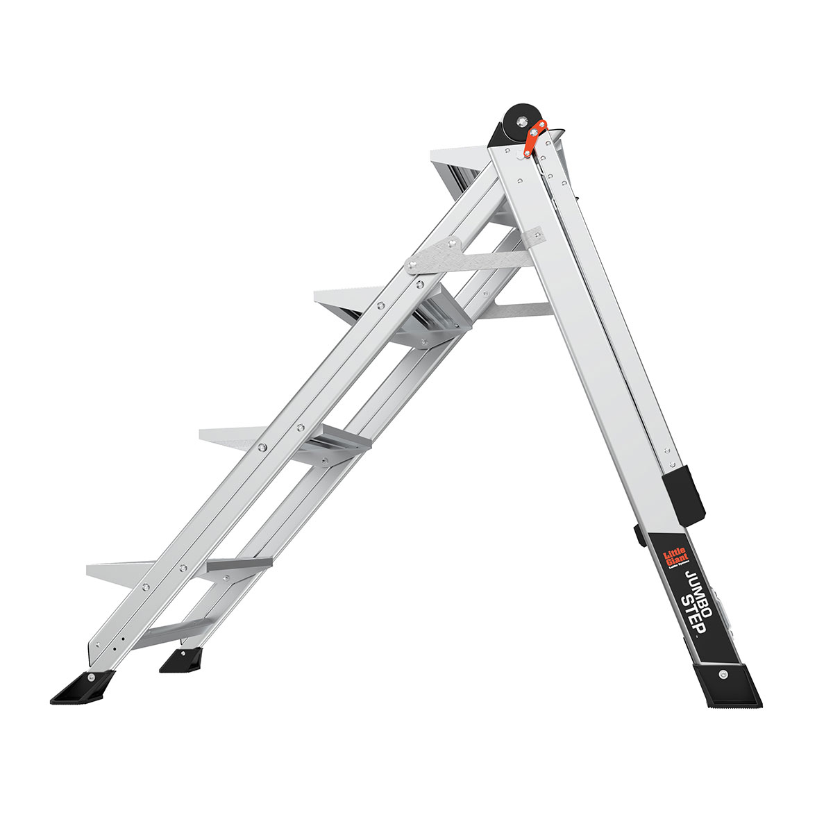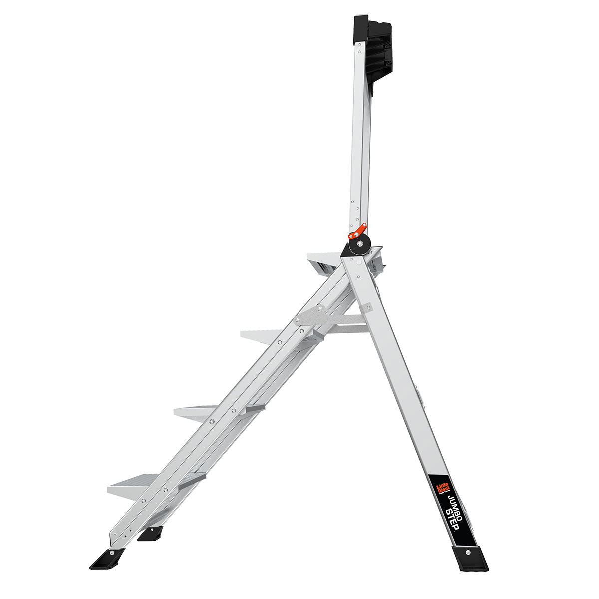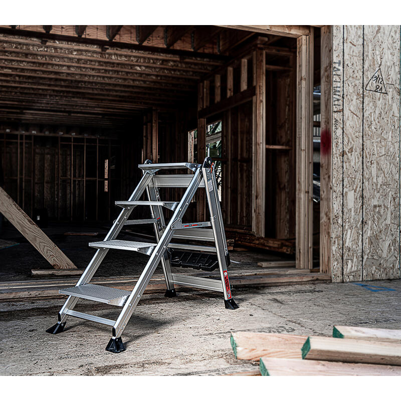 With the Jumbo Step's ultra-wide steps, it feels like walking up a staircase, not a ladder. It is made from lightweight, aircraft grade aluminum and its steps feature a safe, non-slip surface.