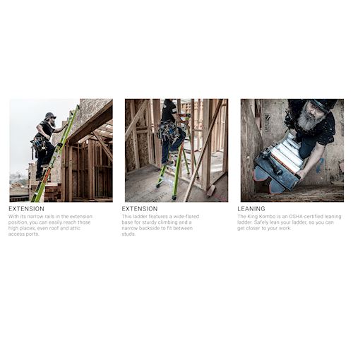 The King Kombo is an OSHA/ANSI compliant leaning ladder. Safely lean your ladder, so you can get closer to your work.