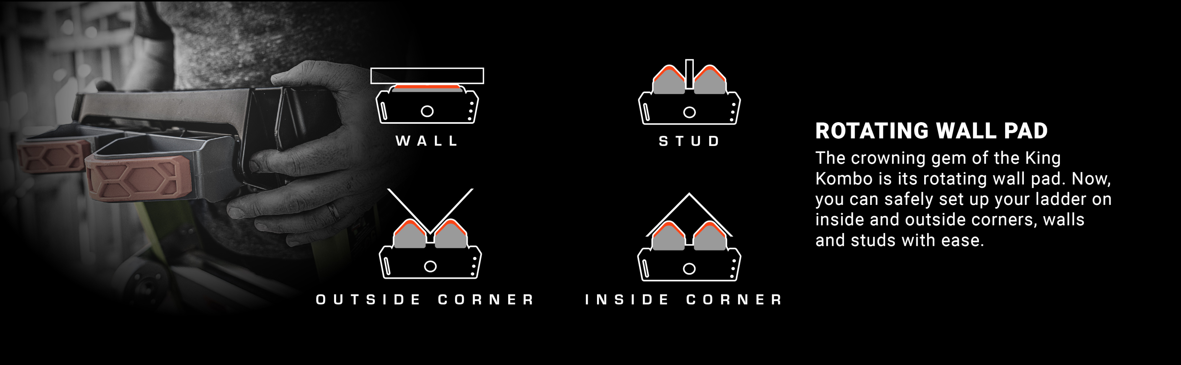The crowning gem of the King Kombo is its rotating wall pad. Now, you can safely set up your ladder on inside and outside corners, walls and studs with ease.