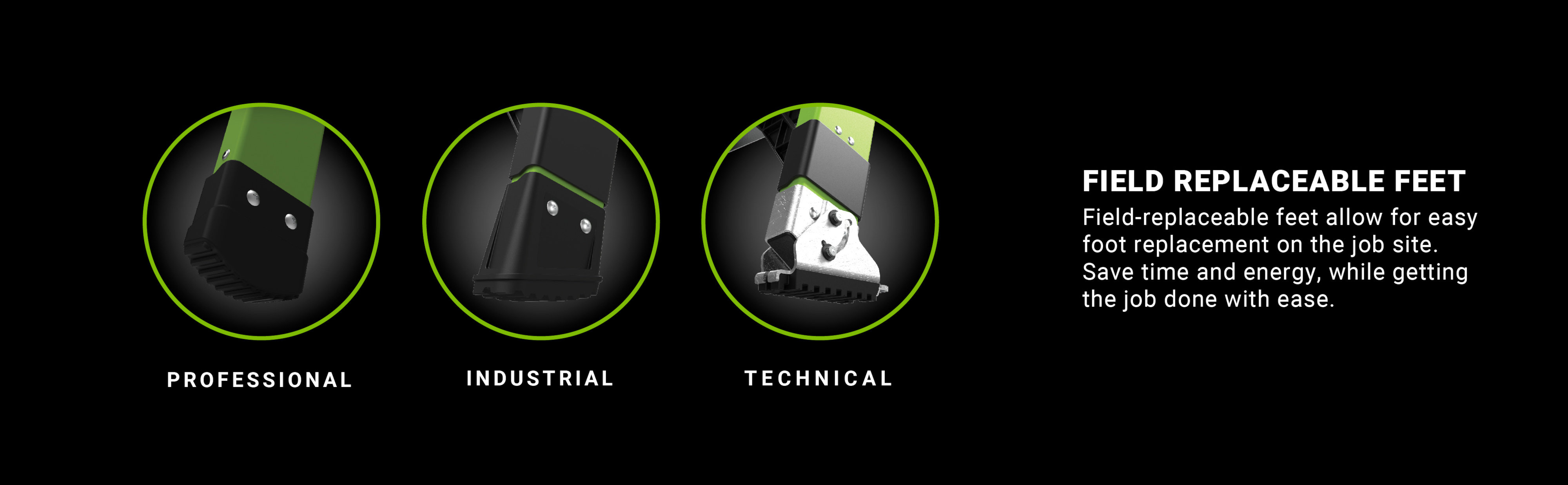 Field-replaceable feet allow for easy foot replacement on the job site. Save time and energy, while getting the job done with ease.