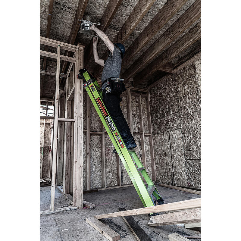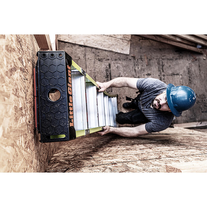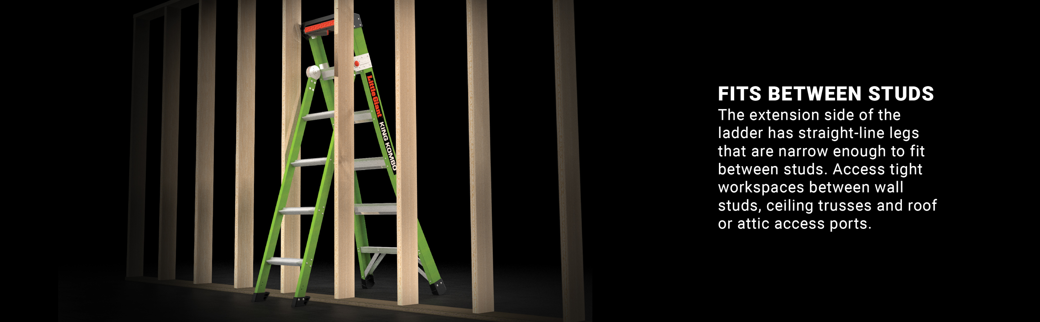 The extension side of the ladder has straight-line legs that are narrow enough to fit between studs. Access tight workspaces between wall studs, ceiling trusses and roof or attic access ports.