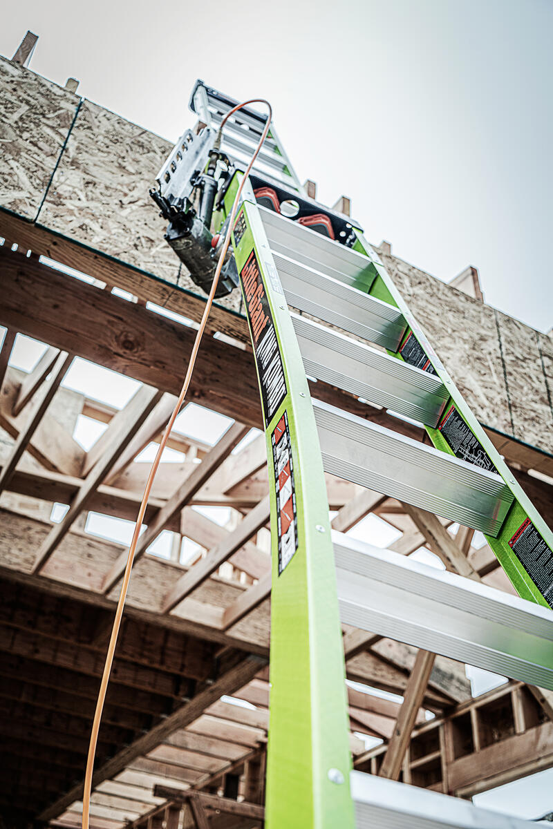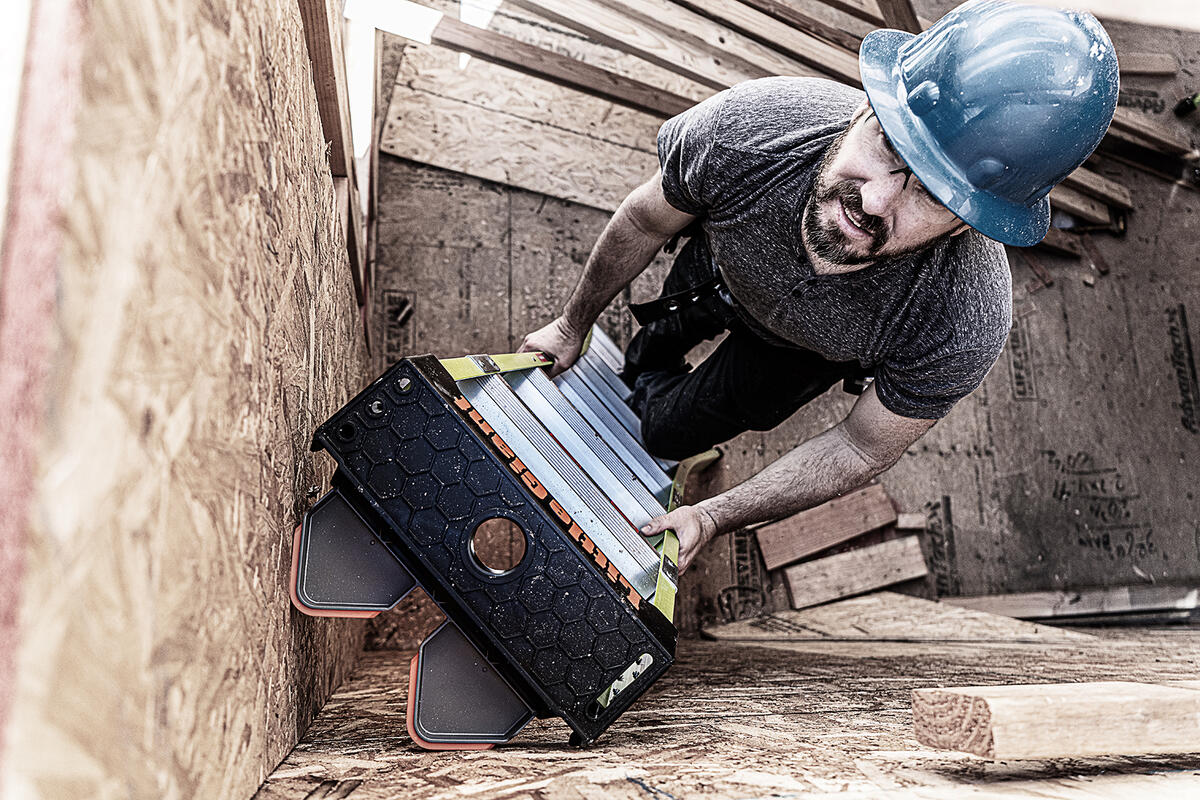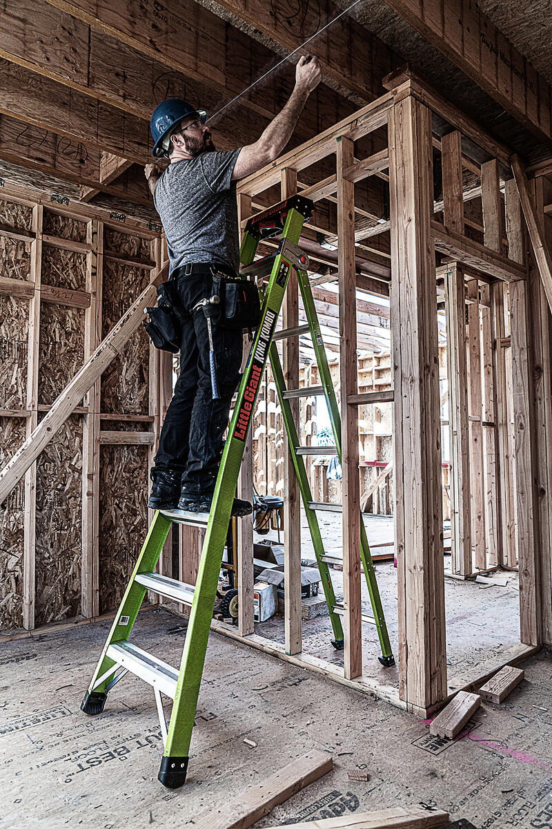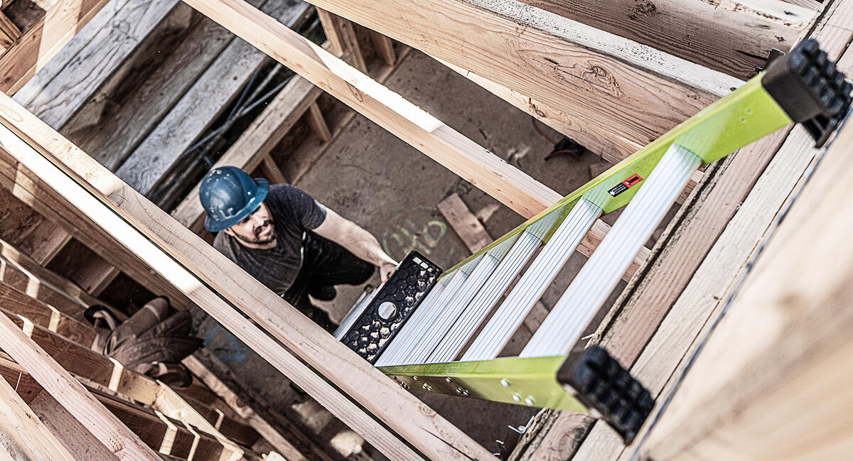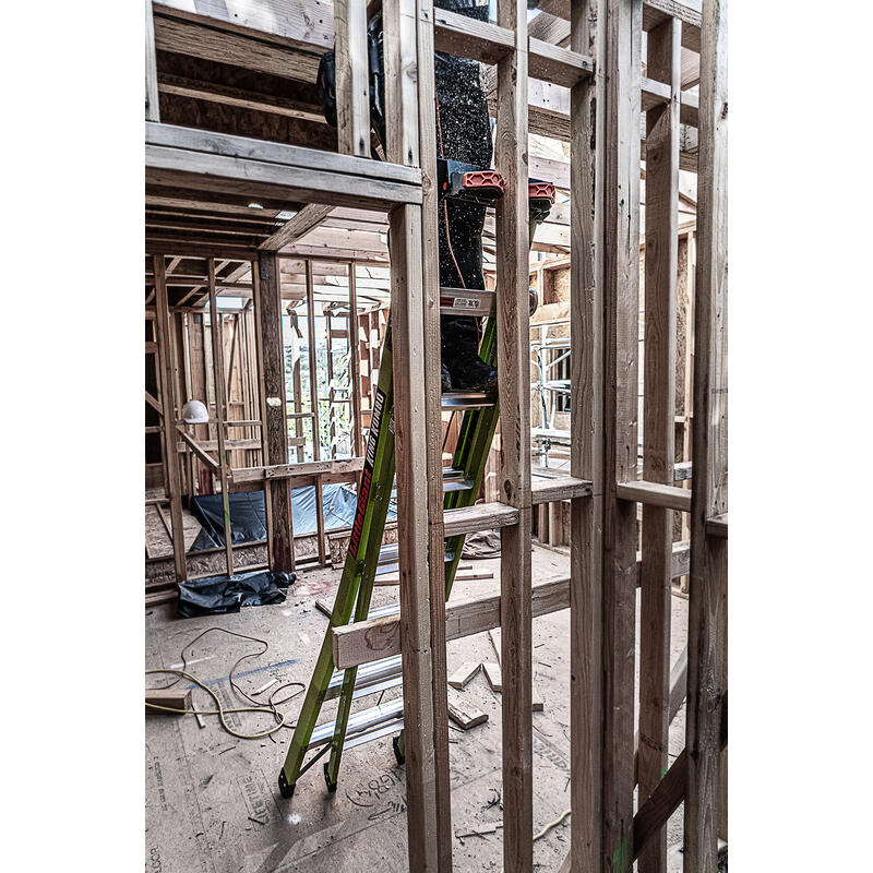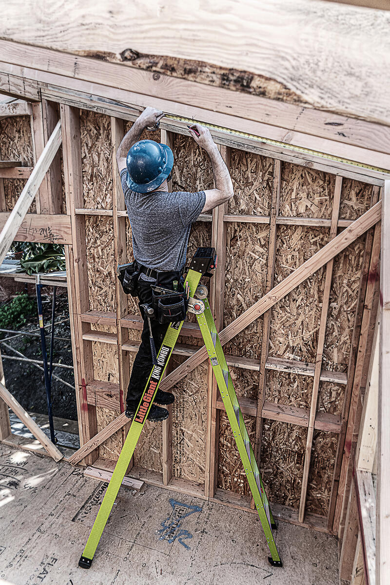 This ladder features a wide-flared base for sturdy climbing and a narrow backside to fit between studs.
