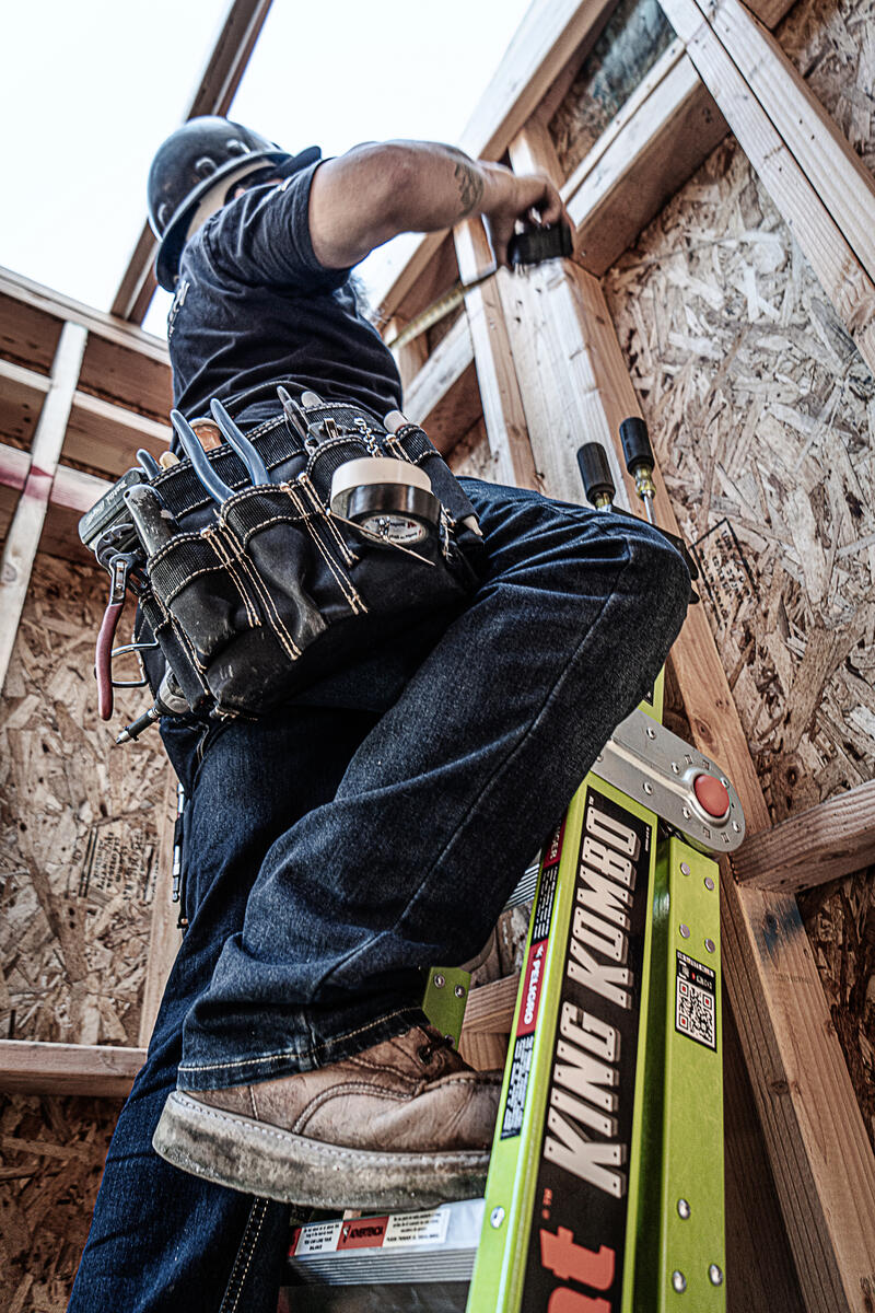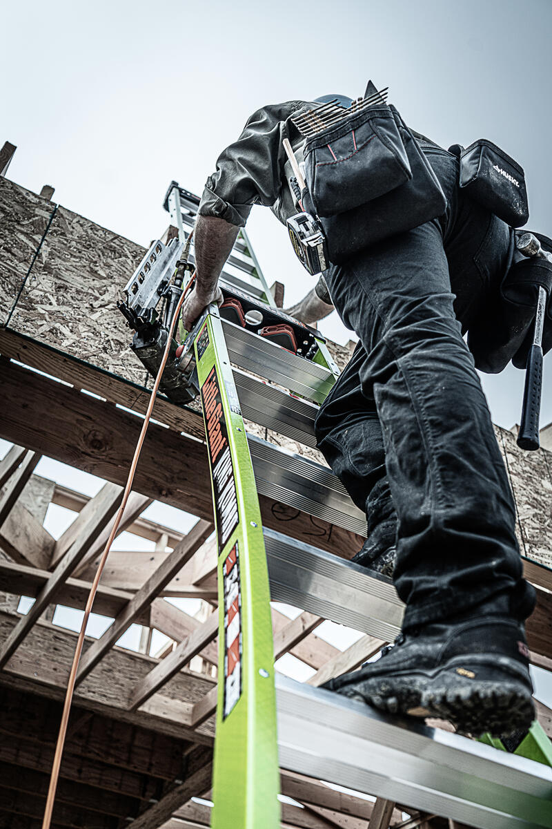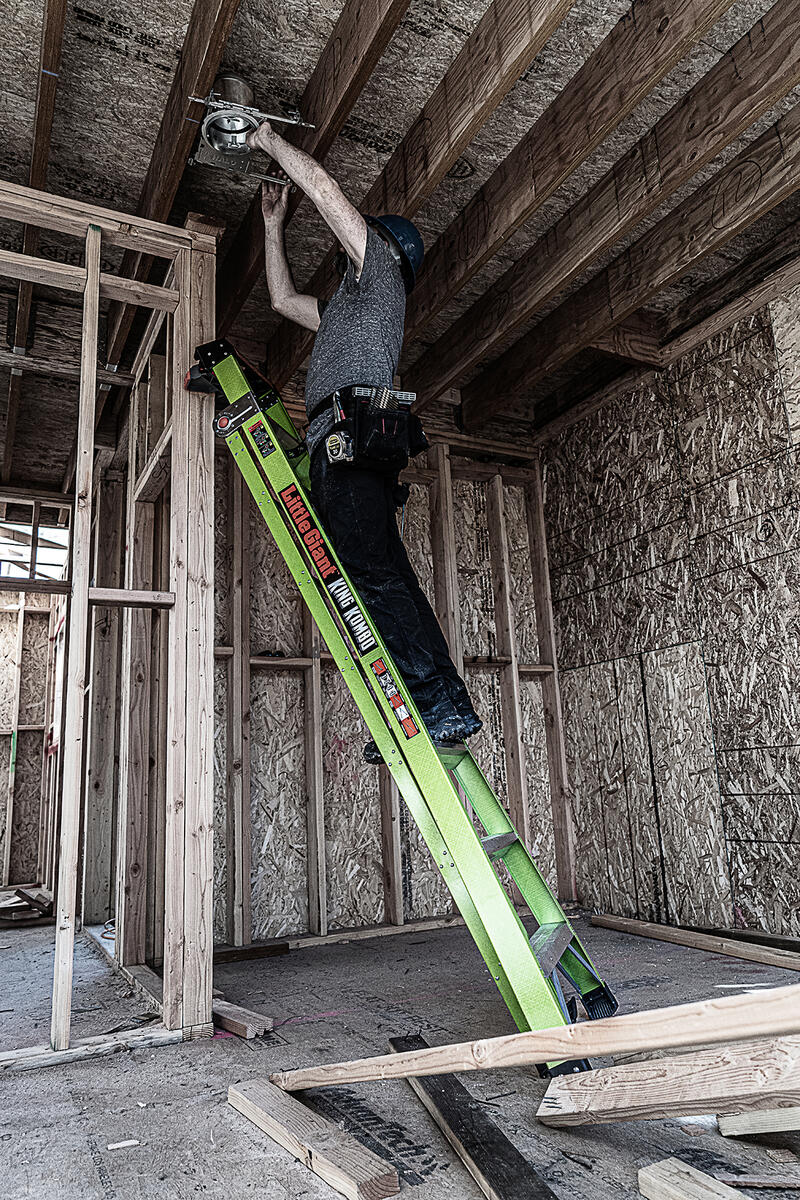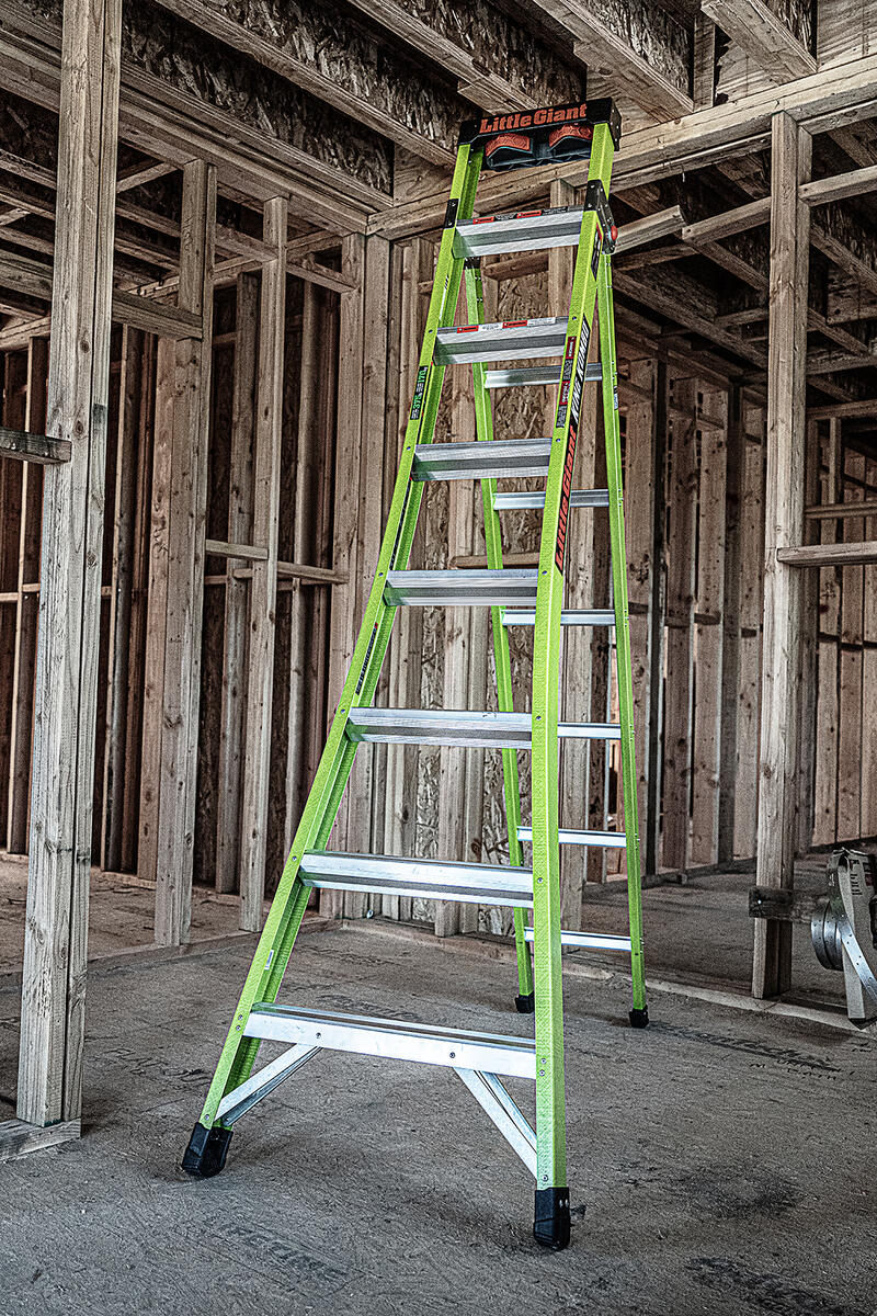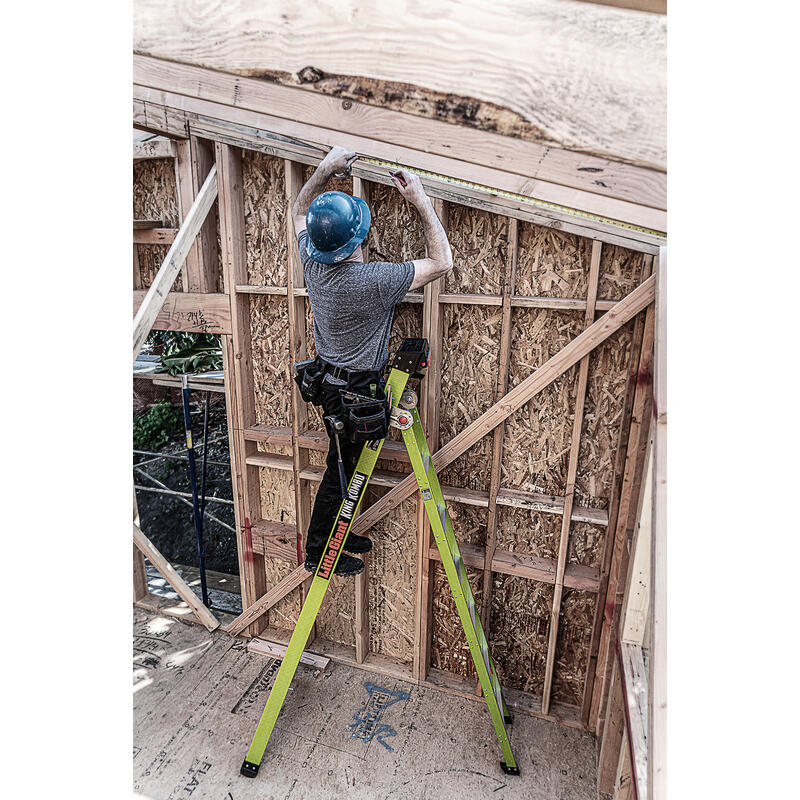 This ladder features a wide-flared base for sturdy climbing and a narrow backside to fit between studs.