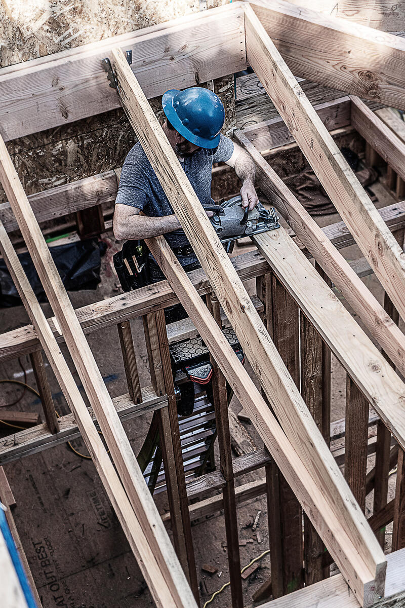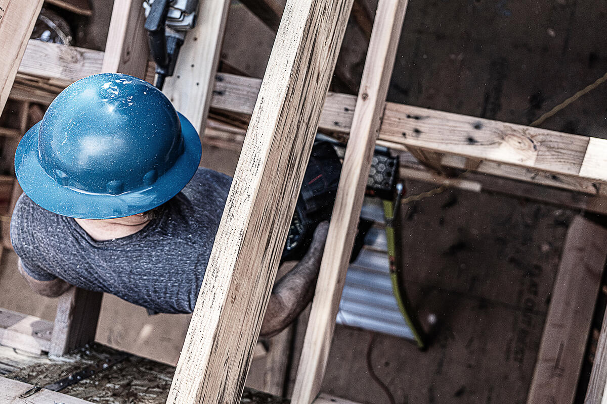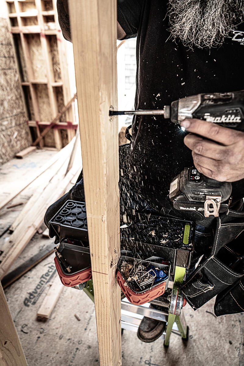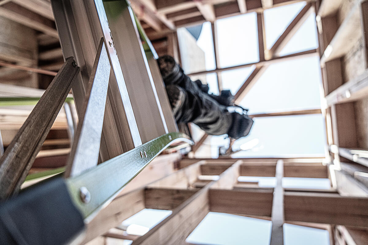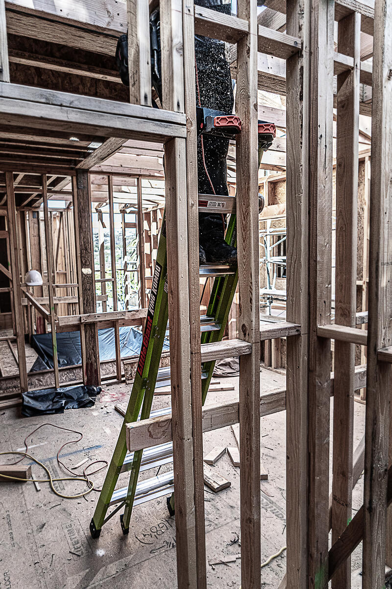 This ladder features a wide-flared base for sturdy climbing and a narrow backside to fit between studs.