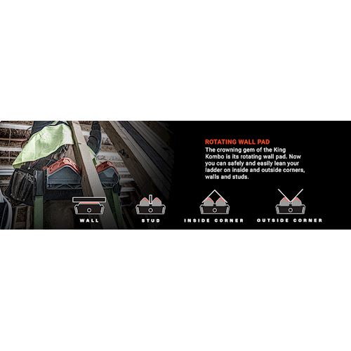 The crowning gem of the King Kombo is its rotating wall pad. Now, you can safely set up your ladder on inside and outside corners, walls and studs with ease.