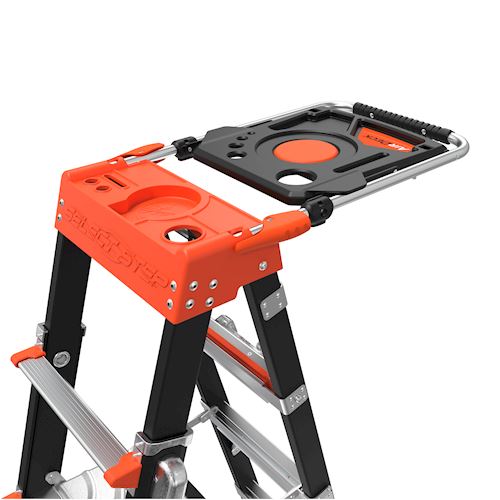 You use your ladder to get stuff done and the AirDeck® accessory ports make it even easier to do so. Attach the Little Giant AirDeck to the Select Step ladder, so you can have a convenient workstation at the top of the ladder. It also doubles as a safety handrail to minimize feelings of vertigo while working up high.