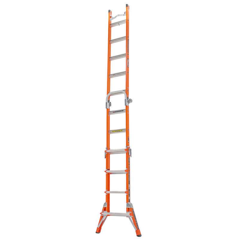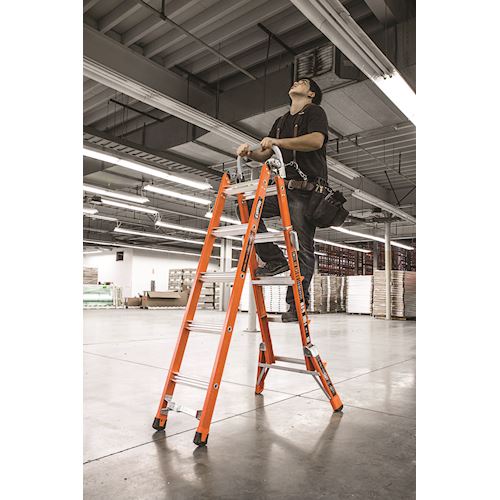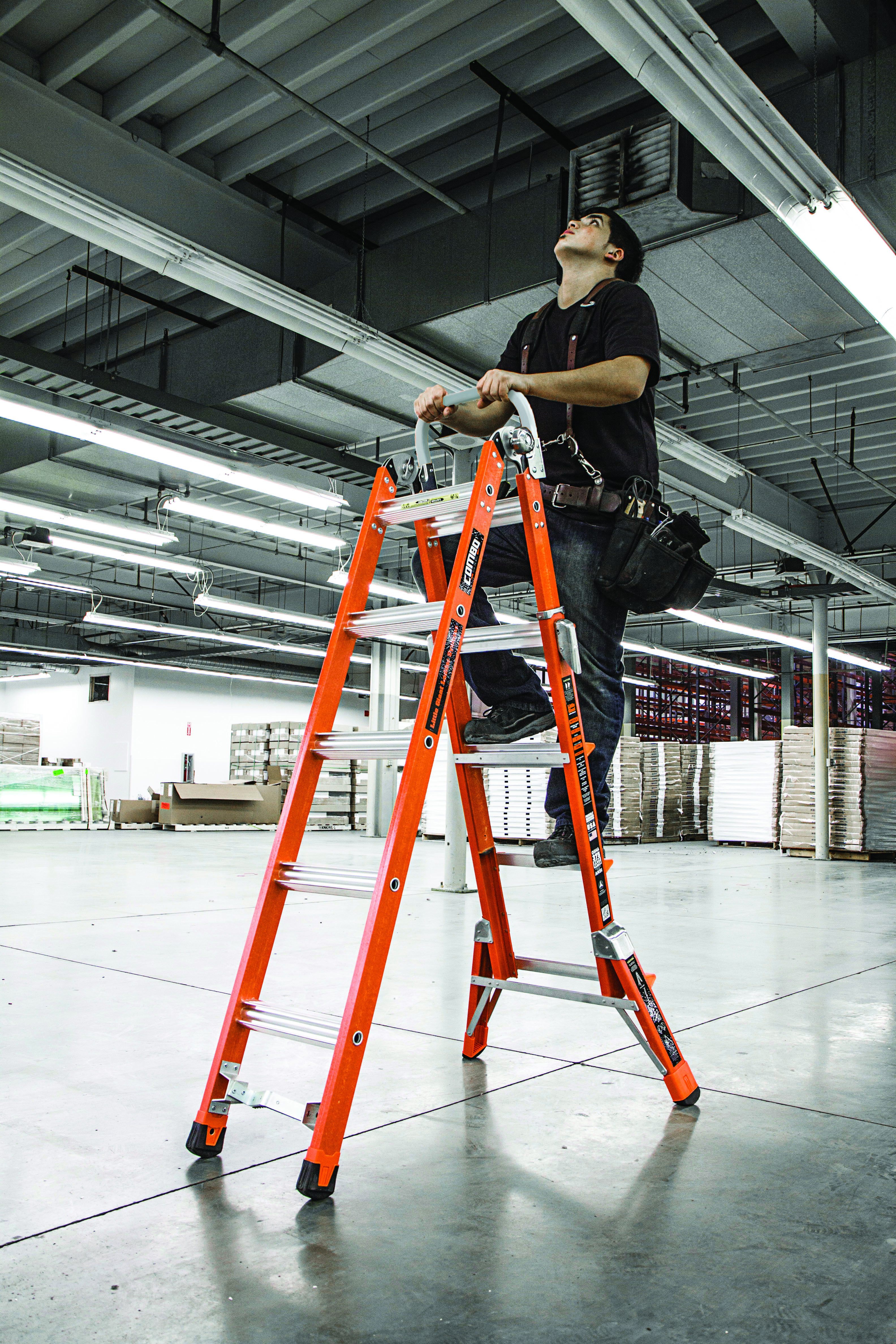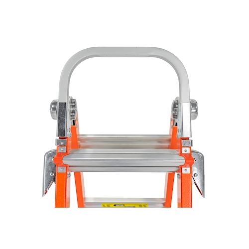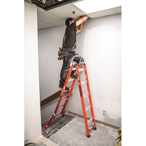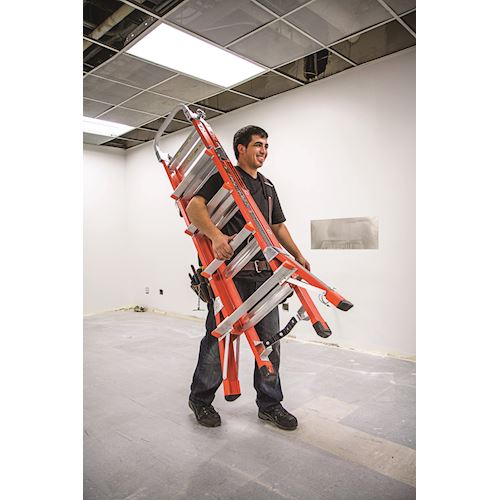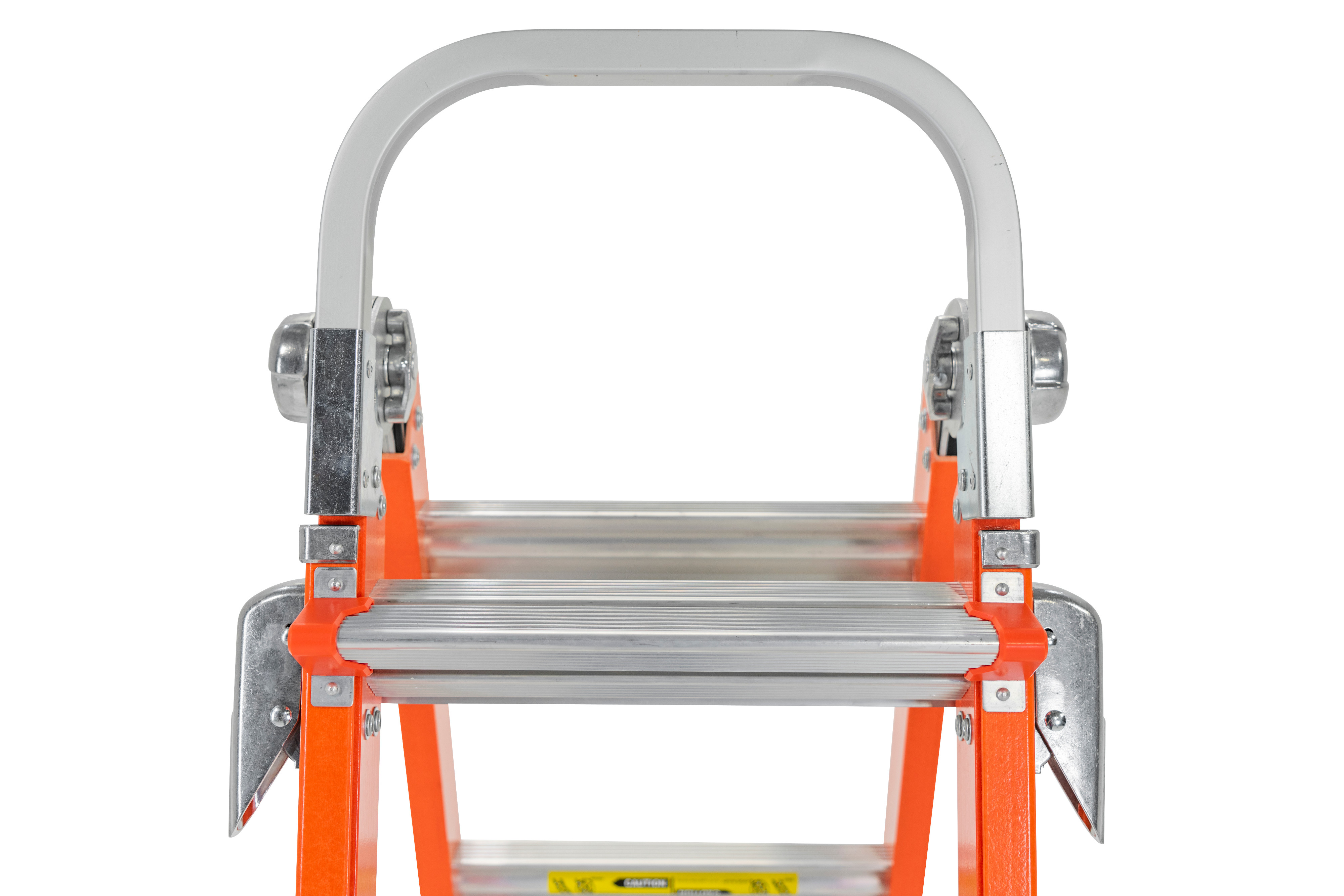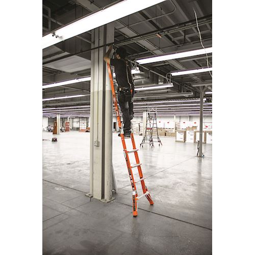 This ladder has a wide-flared base and a narrow, functional extension, so you can reach tight attic access ports while in extension ladder configuration. A safety handrail at the top of the stepladder configuration minimizes sensations of unsteadiness or vertigo while working. Made from lightweight, non-conductive fiberglass, you will be able to get your work done quickly, safely and efficiently.