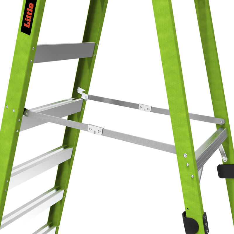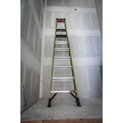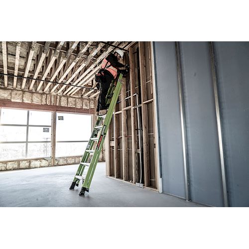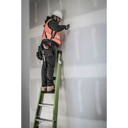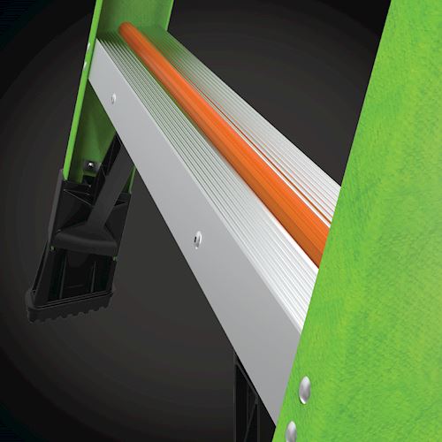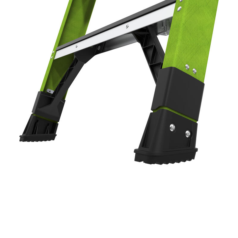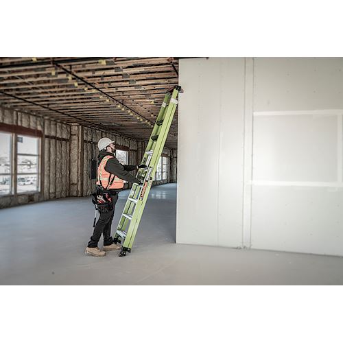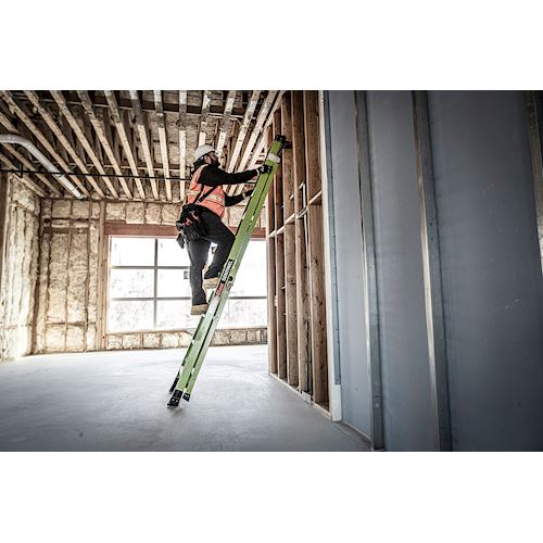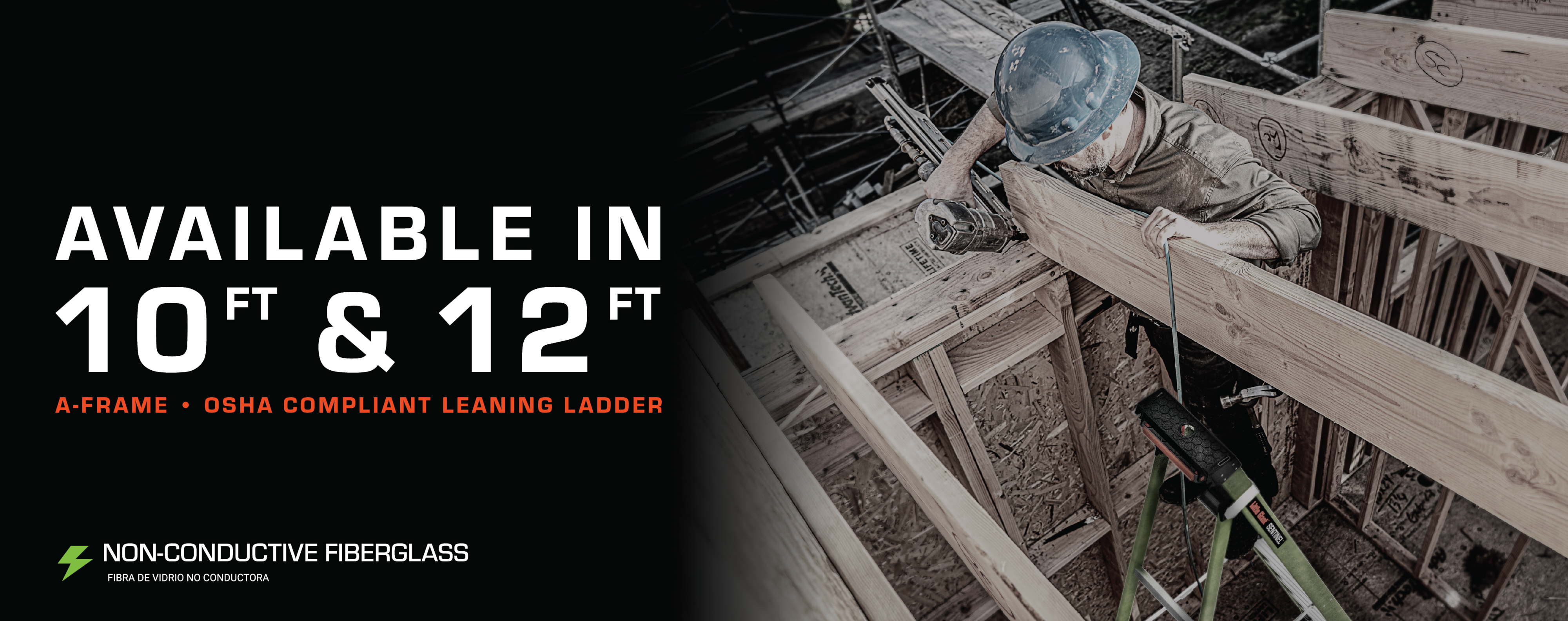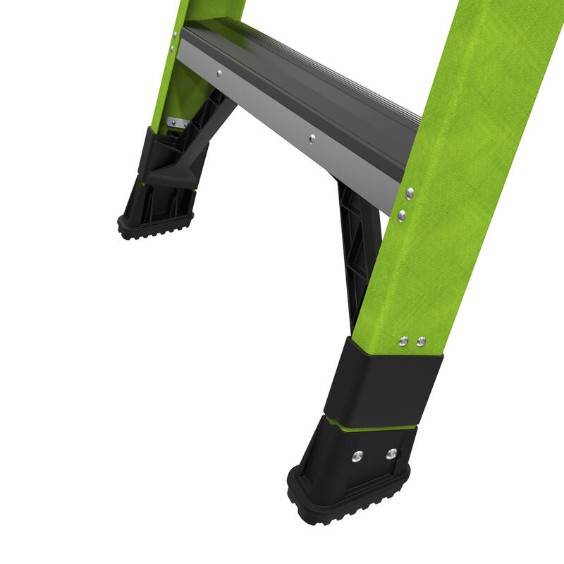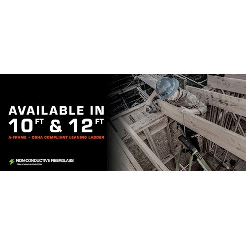Available in 10 ft and 12 ft. Non- conductive fiberglass. A-frame • Osha compliant leaning ladder.