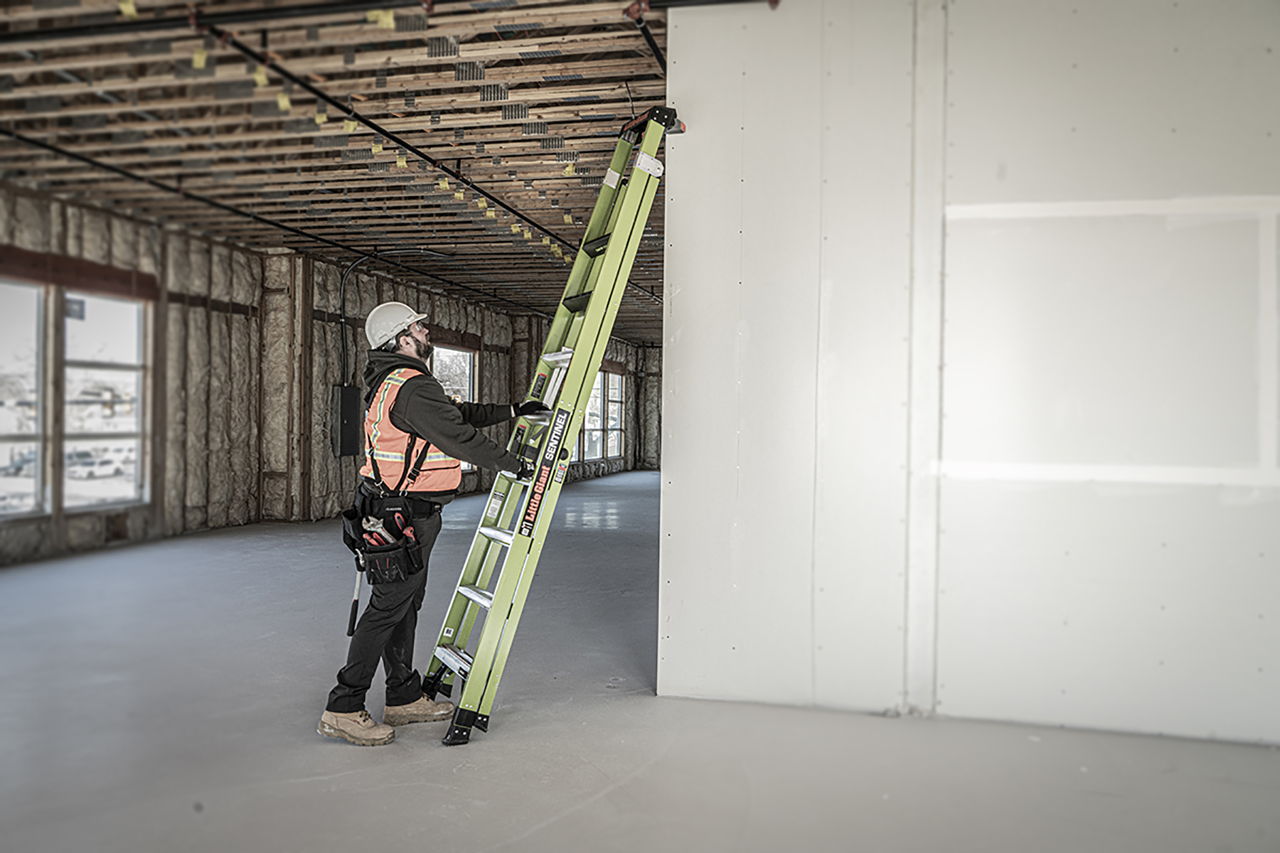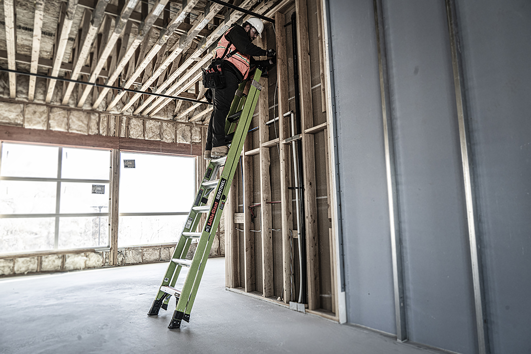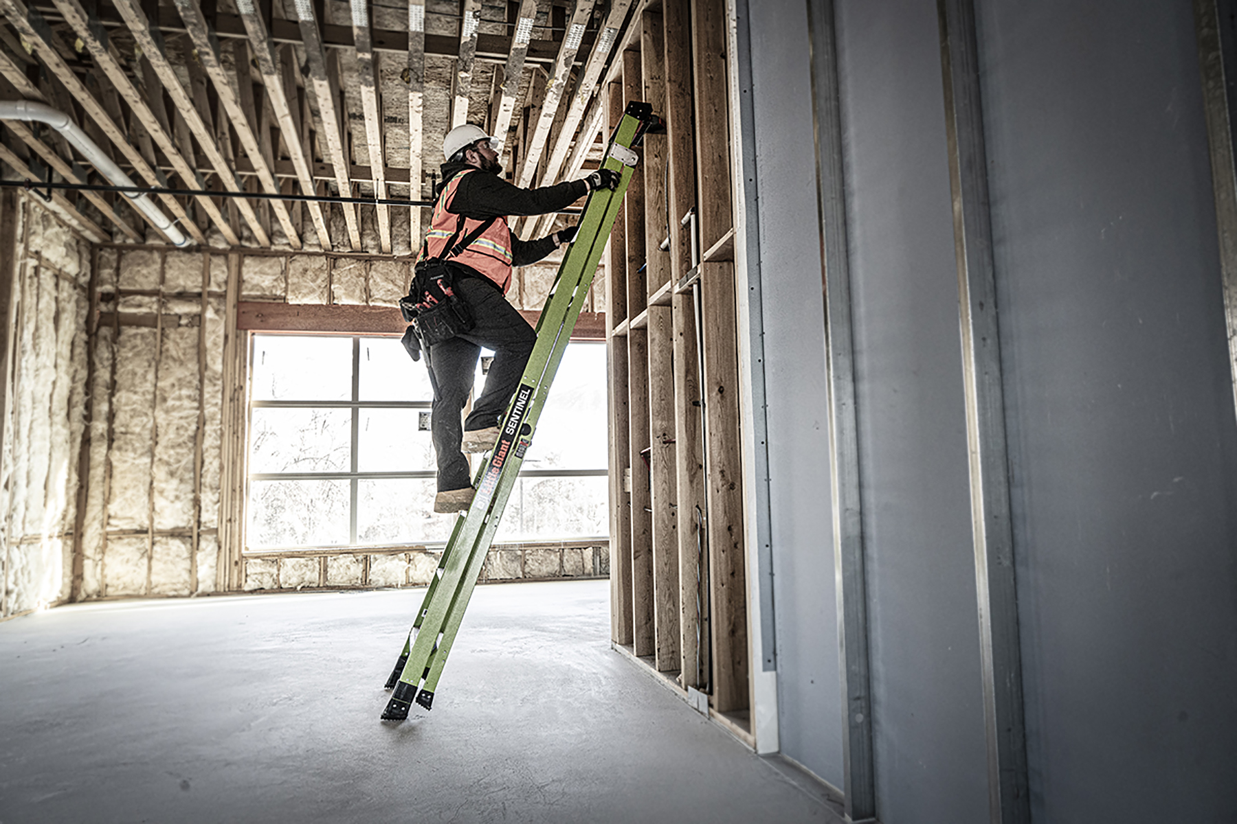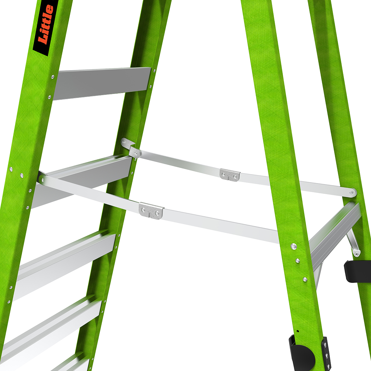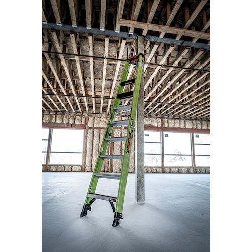 Available in 10 ft and 12 ft. Non- conductive fiberglass. A-frame • Osha compliant leaning ladder.