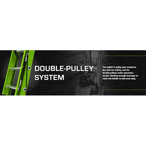 Keep your feet free. The ladder's pulley was moved to the side for safety, and its double-pulleys make operation simple. Getting enough leverage to raise the ladder is fast and easy.
