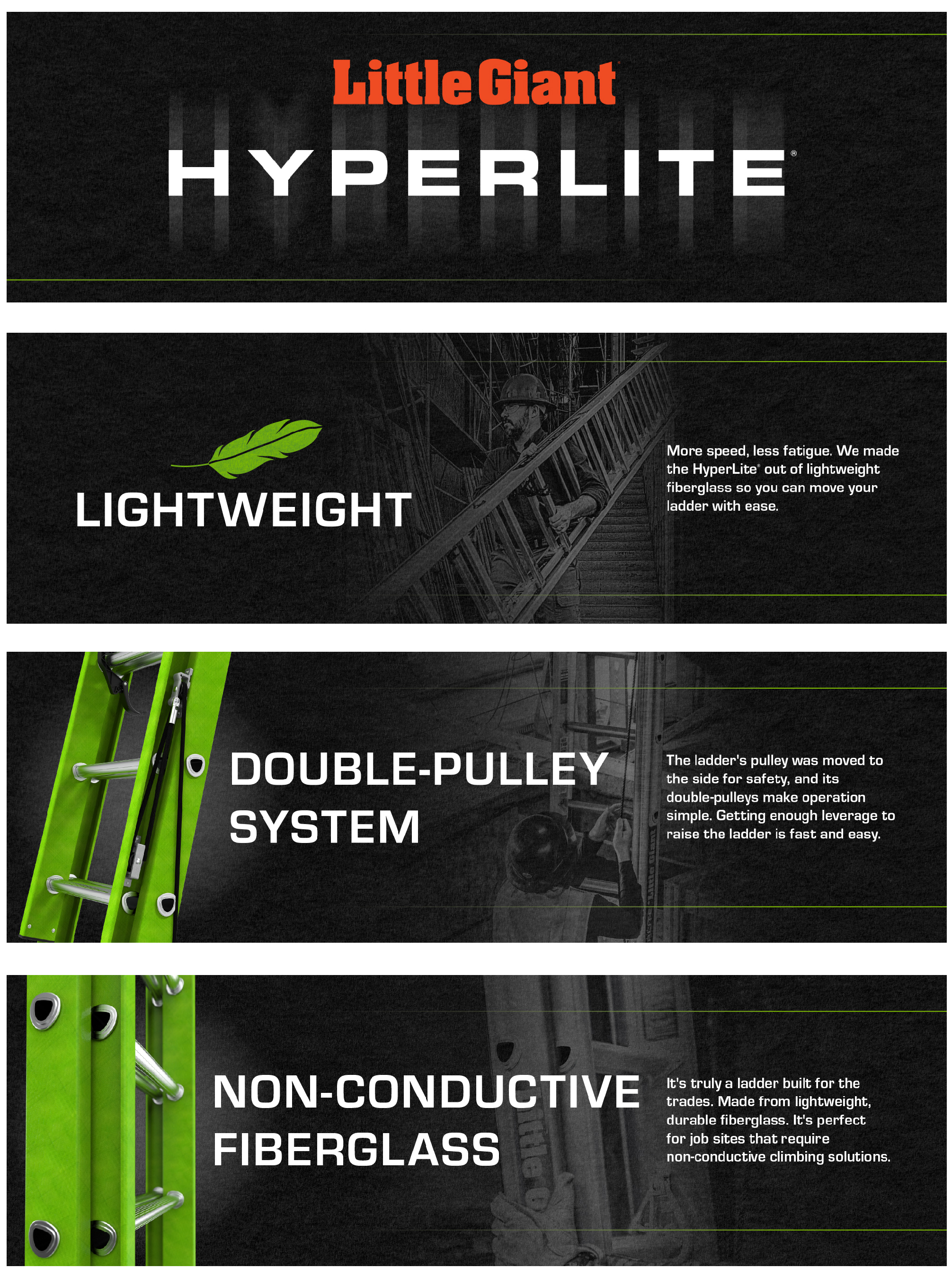More speed, less fatigue. We made the Hyperlite out of lightweight fiberglass so you can move your ladder with ease.