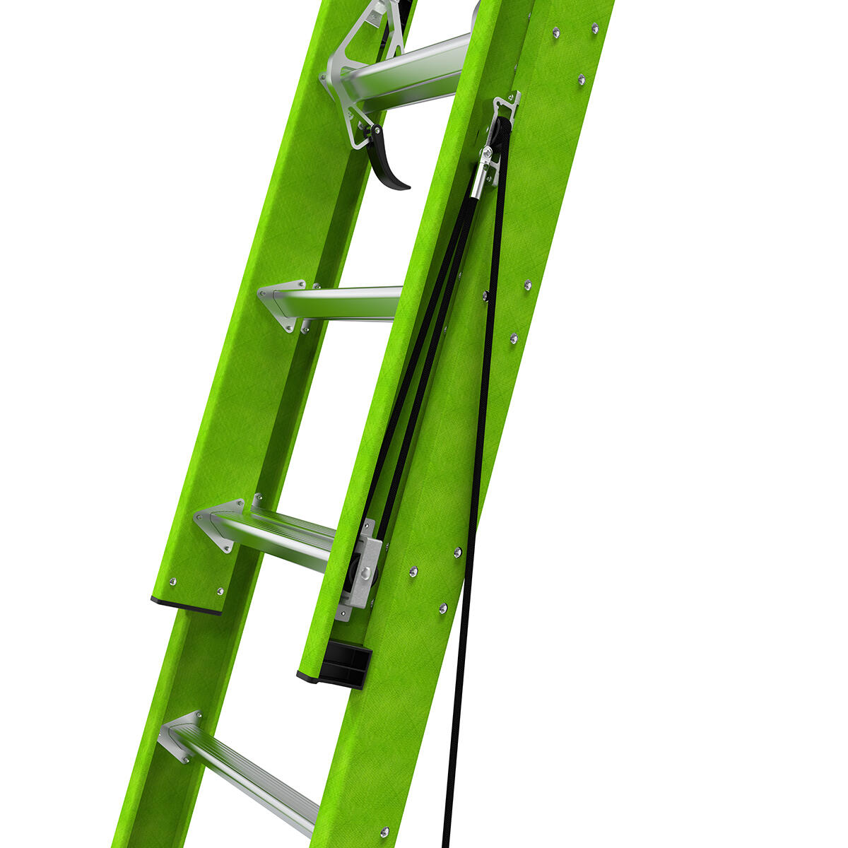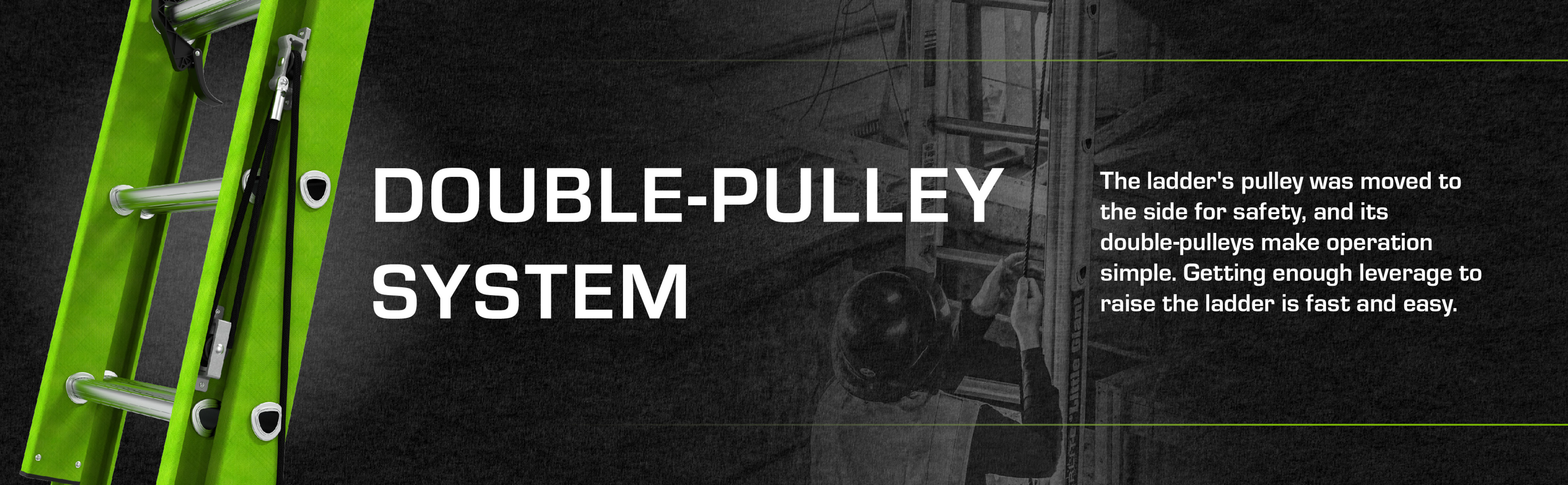 Keep your feet free. The ladder's pulley was moved to the side for safety, and its double-pulleys make operation simple. Getting enough leverage to raise the ladder is fast and easy.